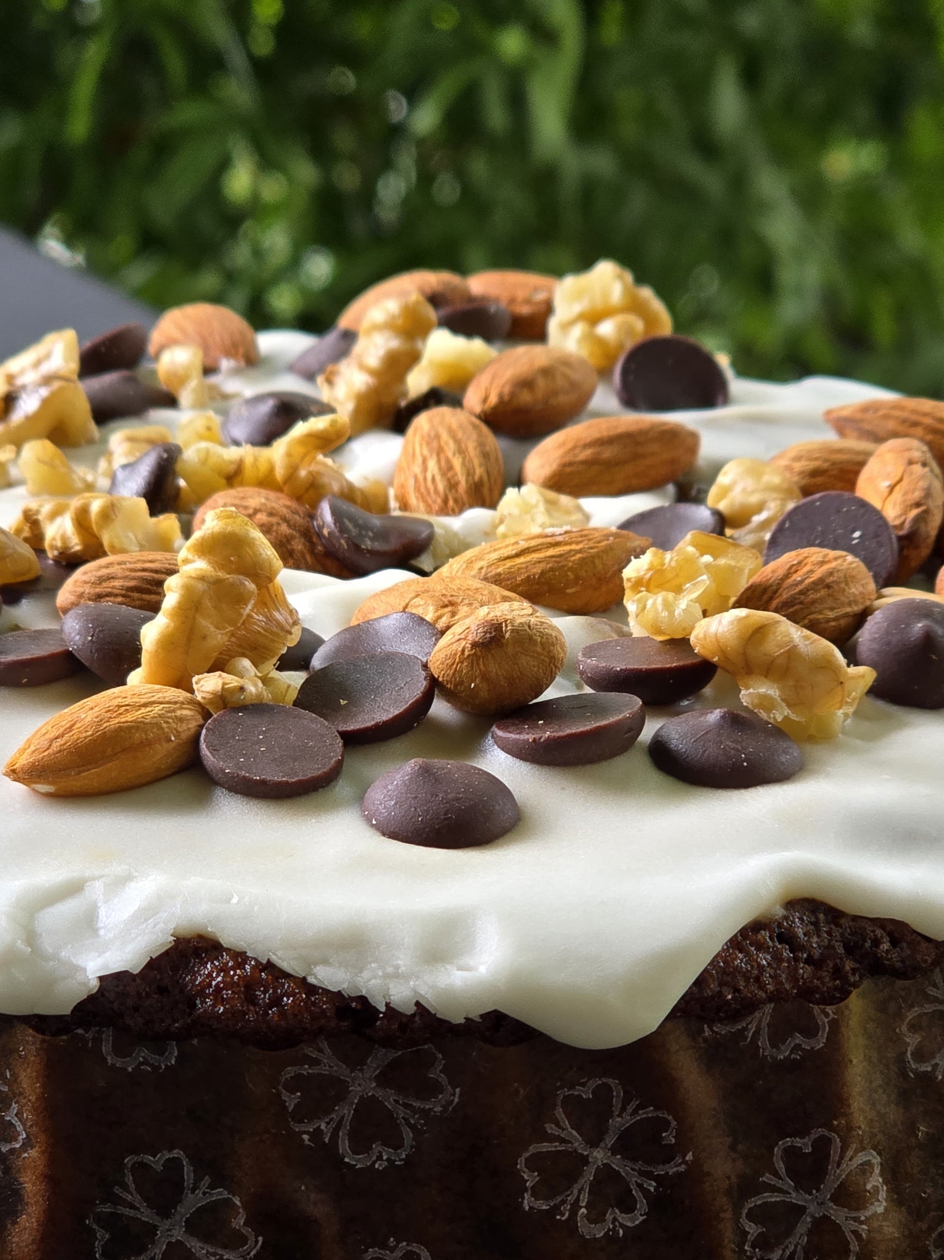 Húmedo pan de pascua sin fruta confitada. Almendras y nueces tostados ,chocolate belga y los sabores del pan de pascua , decorado con glace , frutos secos y chocolate